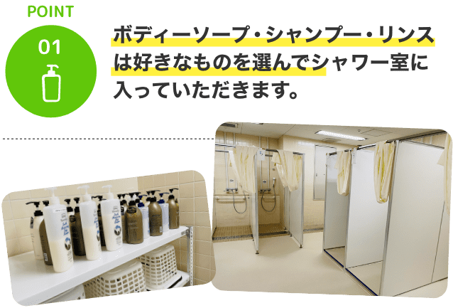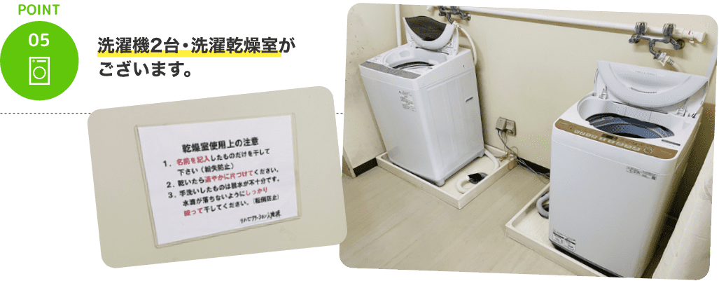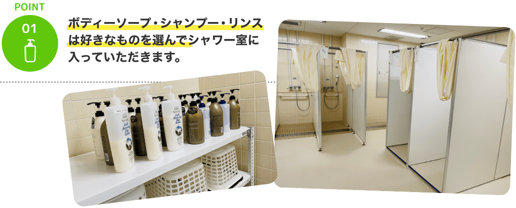 シャンプー、リンス、ボディソープ、ドライヤー、洗濯機、乾燥機があります。